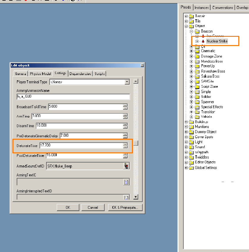 If the script looks for the ten second nuke then edit the detonate time on the object to be longer..
