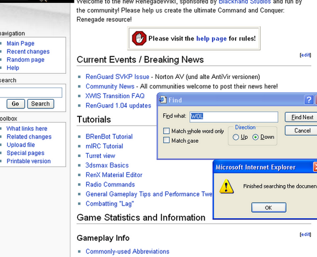 Why is Wiki in bold eye candy type, and you cant dig up a clue about the WOL change with a dozer? I come here on a regular basis and I had no idea that this change was taking place until I visited http://black-cell.net/. Seems to me, with as many people who play WOL that this http://xwis.net/ would be everywhere, including the rengaurd splash screen. Hell, I almost downloaded ad-ware so I could play Renegade. Have you people heard of AADD? Please be aware that there are people in this community that have a short attention span, and only follow shinny objects, and so on. Terrell Owens is a jackass, but I love to see Philly having hell. Well, I hope this helps someone. BTW here is the link to the tool.