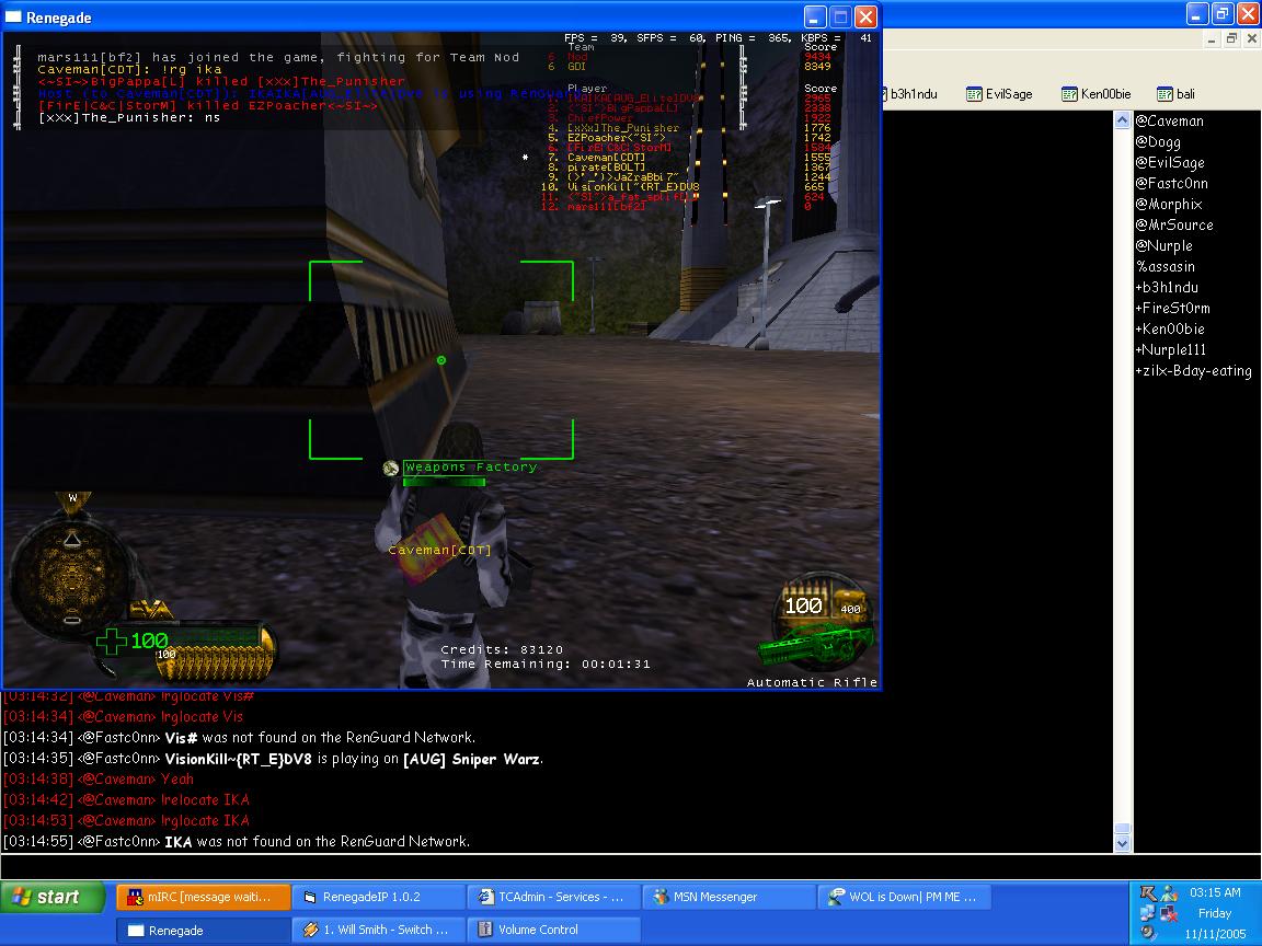 btw u are a lieing idiot. like i said no1 has access to my irc and for you to say u have seen some1 posting msgs ingame from irc other then me or my girlfriend you are absolutly lieng. also if you read the bot msg you will also see that it was another bot for my AOW server that was saying i was on the network, and i felt no reason to post the ss for the sniper bot becasue they were both saying the same thing. I have 2 bots 1 is for a sniper server and the other is for the AOW server. they both run properly and there is alot of ppl out there that will tell u that i dont cheat dont need to cheat. i will leave that up to ppl like u have have used them. and yes u have told me i used them for testing. LMAO like i really would beleave that. when i ran RTE and AUG and HFS and other clans no1 could even use them in anyway. so FUCK YOU and your dictored ss dont know how you didnt it but feel free to rg me anytime.