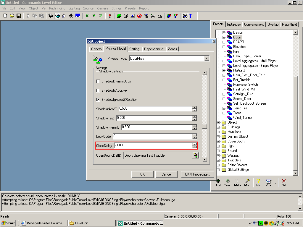 Ok I am working on a new map with a buddy of mine (stallion-david) I am doing the renx and helpign with level edit and he is designing and doing most the level edit stuff. ( I dont like doing stuff in level edit, building controllers, pts, ect.) Anyway, I am running into some animation and textureing issues on the map. First question is, How do I make text and add a picture onto an object? Second question, I made a chest that is animated to open on the top (which slides back) and the front (which slides to the left and right, 2 doors) It works fine but the door closes and opens way to fast. I need to figure out how to slow it down and to if possible to keep the door open while there in it. Cause its a walk in chest that can close u around it.