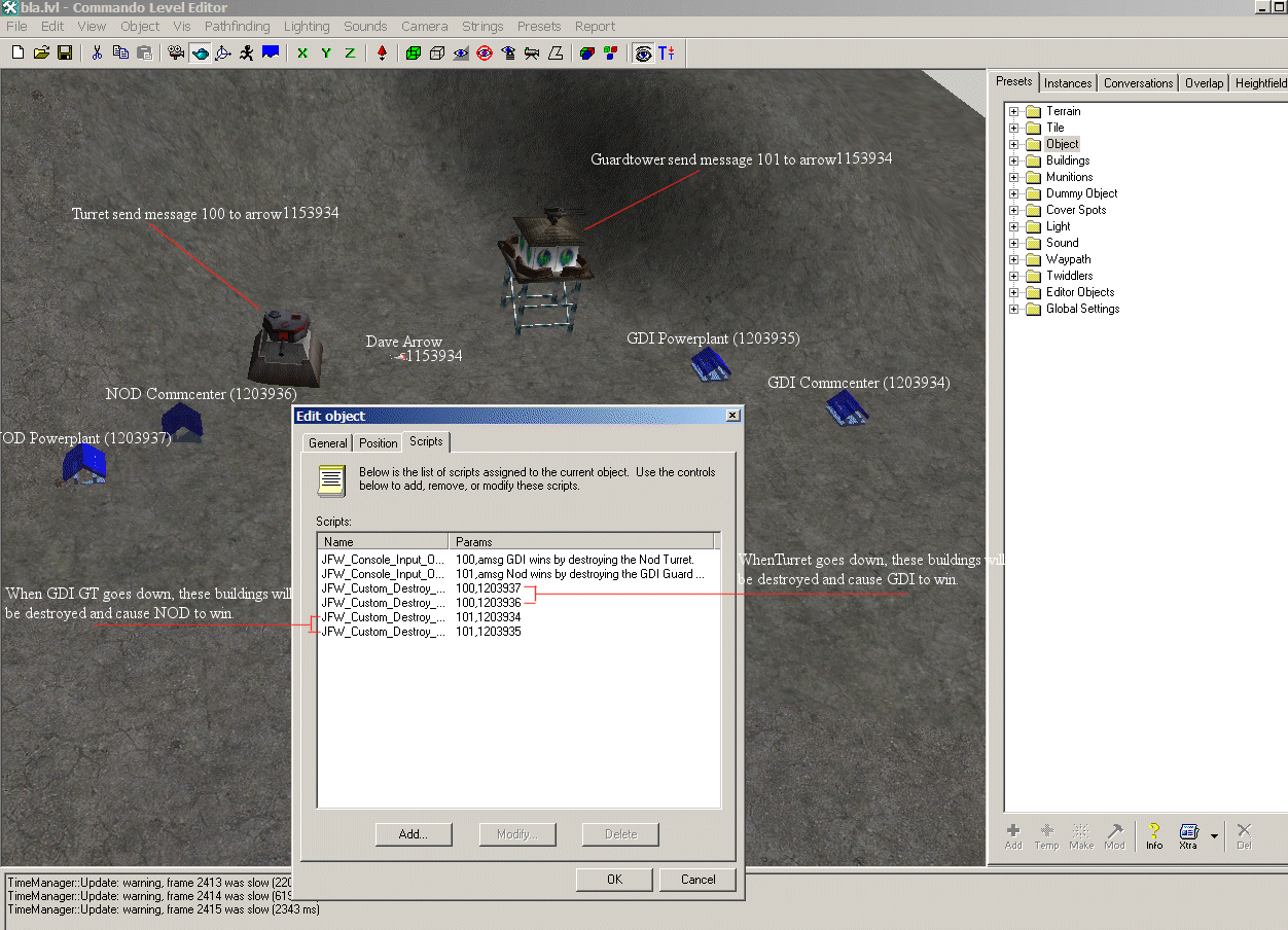 I'm trying to make the game end using scripts after you destroy either the Nod Turret or GDI Guard Tower, could someone tell me how to setup a script?