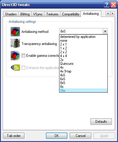 Two new AA modes are now available for SLI users only, an 8x mode and a 16x mode. With the 8x setting, both cards utilize 4x multisampling, with each card using different rotated-grid sampling patterns which are blended together before being output to your screen. Under the new 16x setting, each card runs NVIDIA's 8xS mode with different sampling patterns. If you recall, 8xS combines NVIDIA's traditional 4xMSAA with 2x supersampling for sharper visuals.