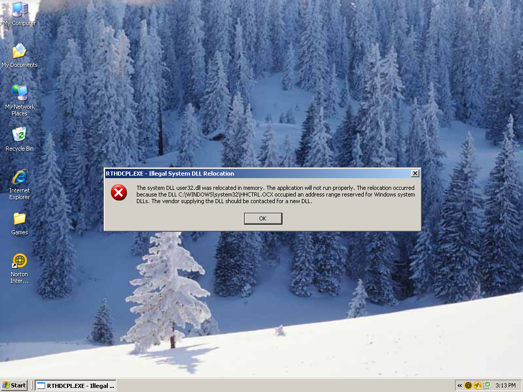 Believe it or not I had to fix this same exact problem on someone's laptop JUST a few days ago. After searching Google for the problem the solution was easy, since the laptop had Realtek integrated sound. Just updated the driver and the error was gone.