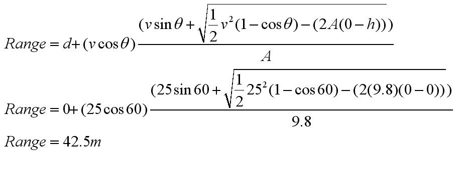R = d + v*cos(theta)*(v*sin(theta)+SqRt(v^2*.5*(1-cos(2theta))-(2*A*(0-h)))/A)