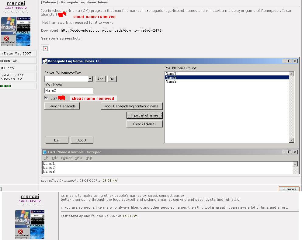 It is strange 2 of the same programs one with cheat ability, and one without came out at the same time, I hardly doubt two different people made these 2 programs, theres never anything updated in US forums renegade area, and for something to be updated here and on their forums, it really gives off that it is you.