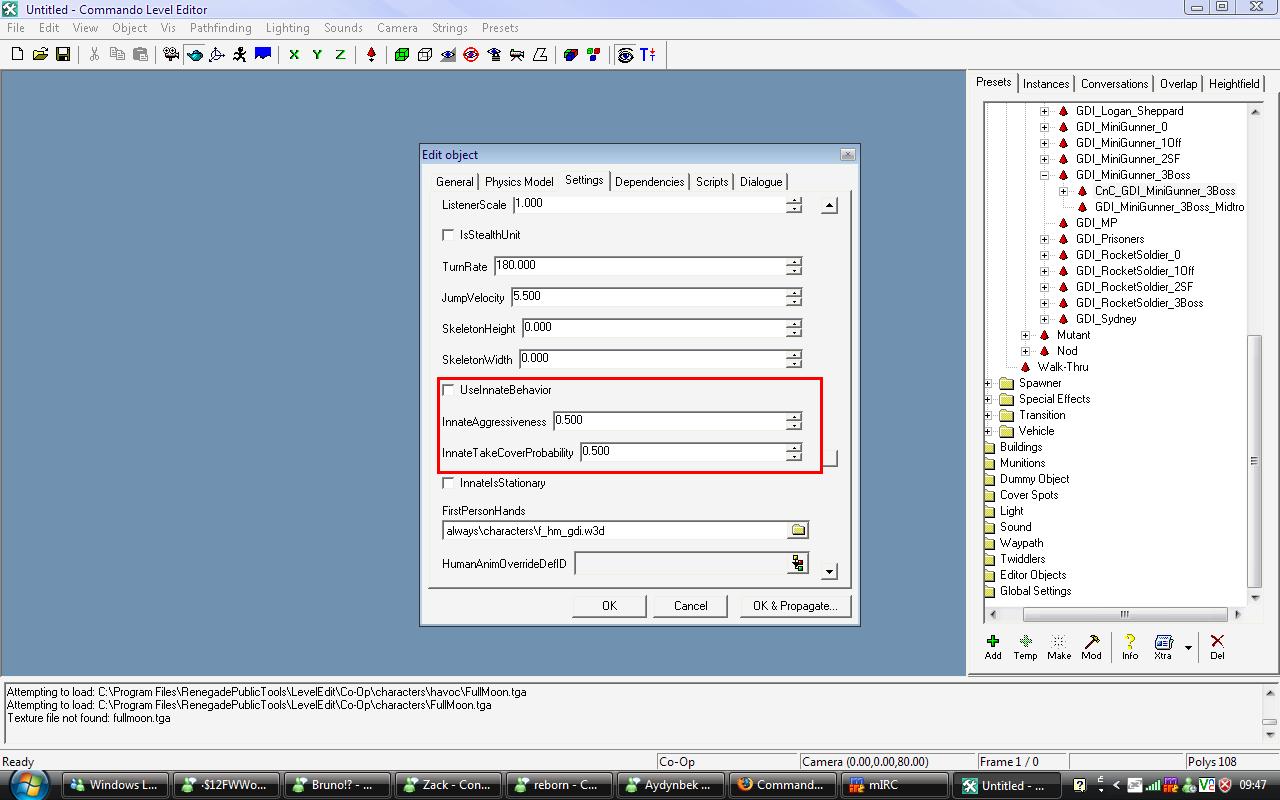Okay in order to get a normal bot to work on a map, you have to run pathfind on the map by placing a pathfind ganerator on the map first then running pathfind. Also temp the GDI_MiniGunner_3Boss preset and call it BOT1 then click on settings and scroll down and make sure that the check box "UseInnateBehavior" is selected. (Just like the picture above)