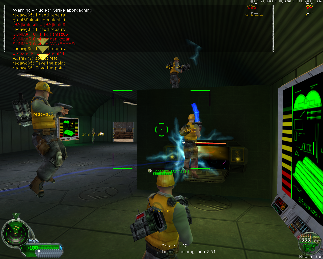 Amazingly fun game on Canyon! It came down to Nod Hon vs GDI Ref fairly early in the game, me and FlipDis rushed in a buggy and got the WF within the first 2 minutes of the game, but they hottie rushed and got our as. Me and Flip killed their bar via sbh nuke whilst I covered, but they got our ref at pretty much the same time. So everyone was fairly low on cash, but I did a fairly goodjob sniping!