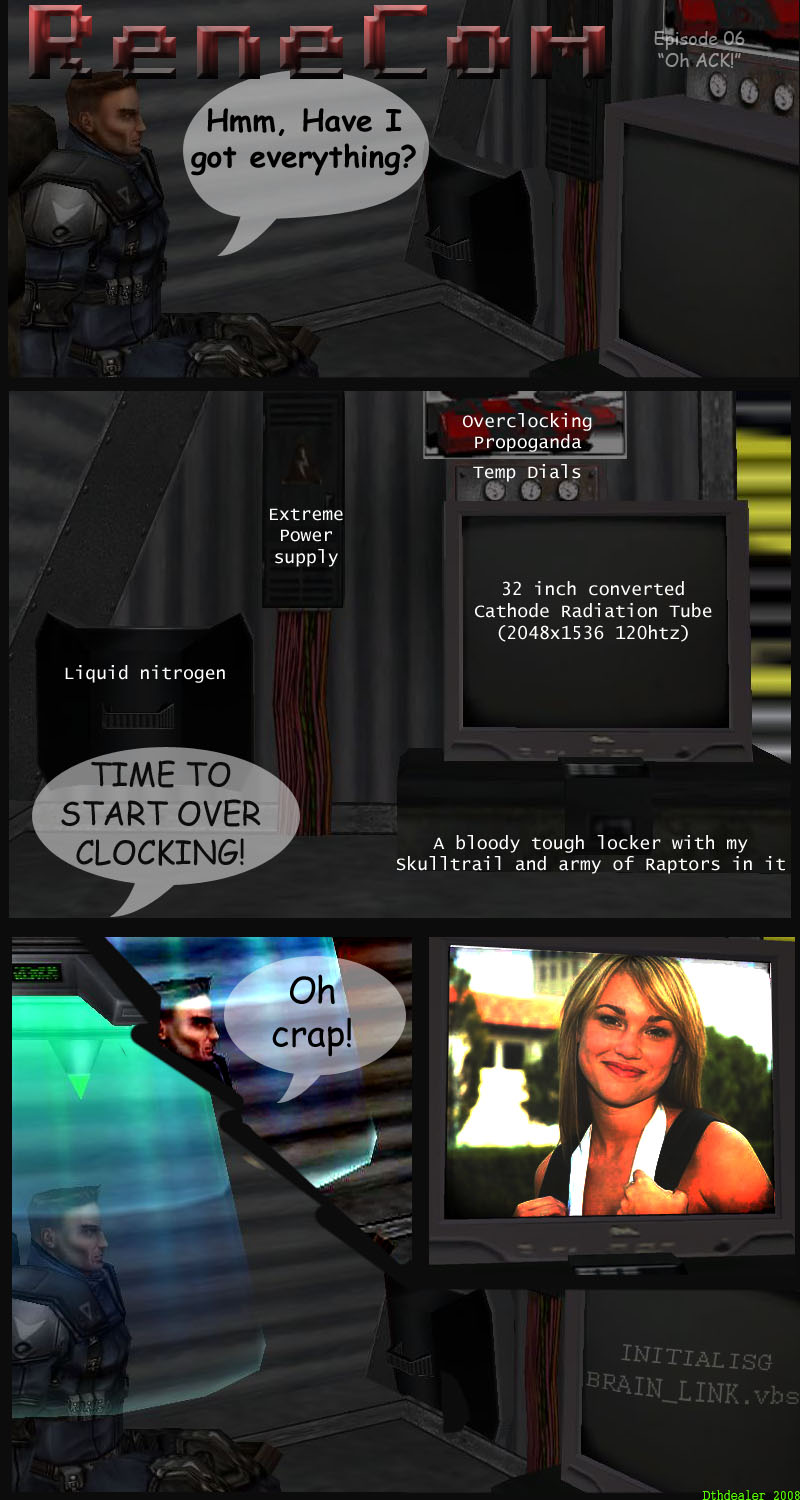 Havoc was posed in RenX for these shots (as describe in the previous post) In the third panel havoc was supposed to have a "bighead", but unfortunately resizing the bone didn't work.