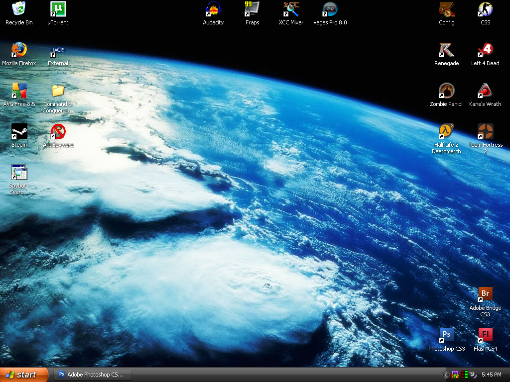 My desktop has no icons, and is the Zeratul Starcraft II wallpaper, found here