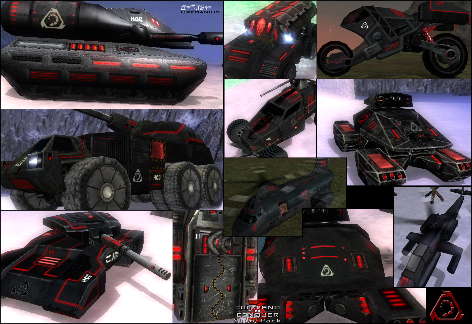 This skin pack includes all GDI Vehicles including the Orca, Harvester and Transport Helicopter, and all Nod vehicles, including the Attack Bike, Transport Helicopter, Apache and Harvester.