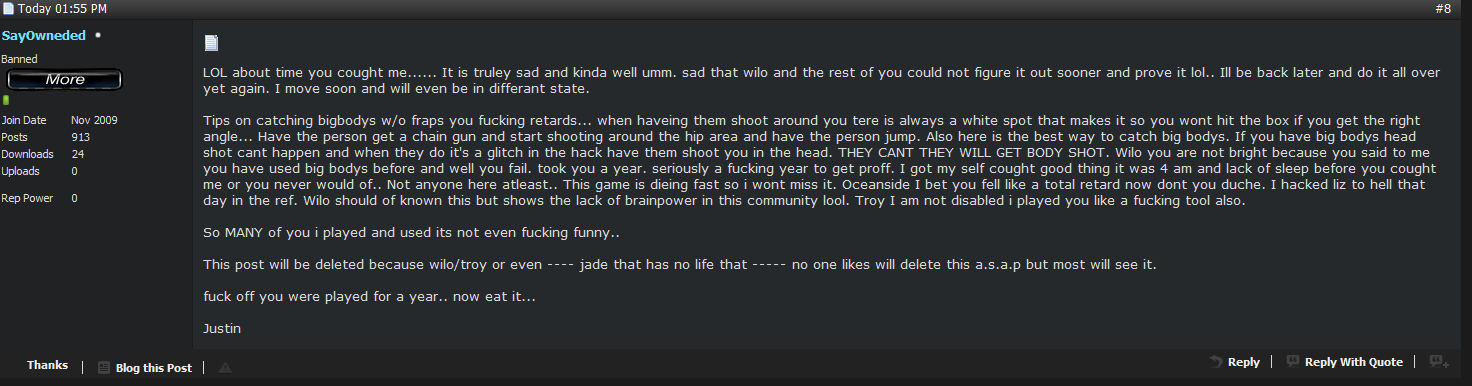 He never abused it directly, he was just one of those retarded people who would claim he has evidence, and is having trouble posting or uploading it. When in reality we all knew he was banning on impulse and rage, without any evidence whatsoever.
