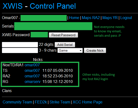 You should be able to see all your nicks on that serial so you can delete some aswell, and a global XWIS pass should be displayed. That pass allows you to login to each of the nicks linked to your registered serial(s).