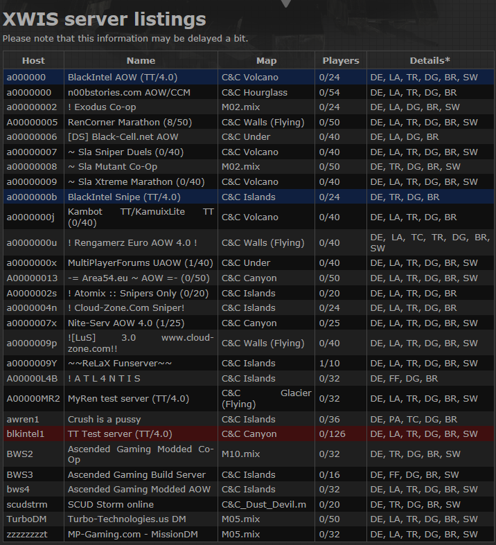 There's like 6 servers online showing up in XWIS and we haven't gone down cause we use WOLProxy (stops the "quitting part" - we remain on in GSA) - we haven't restarted yet cause we have like 20 people in the server :/