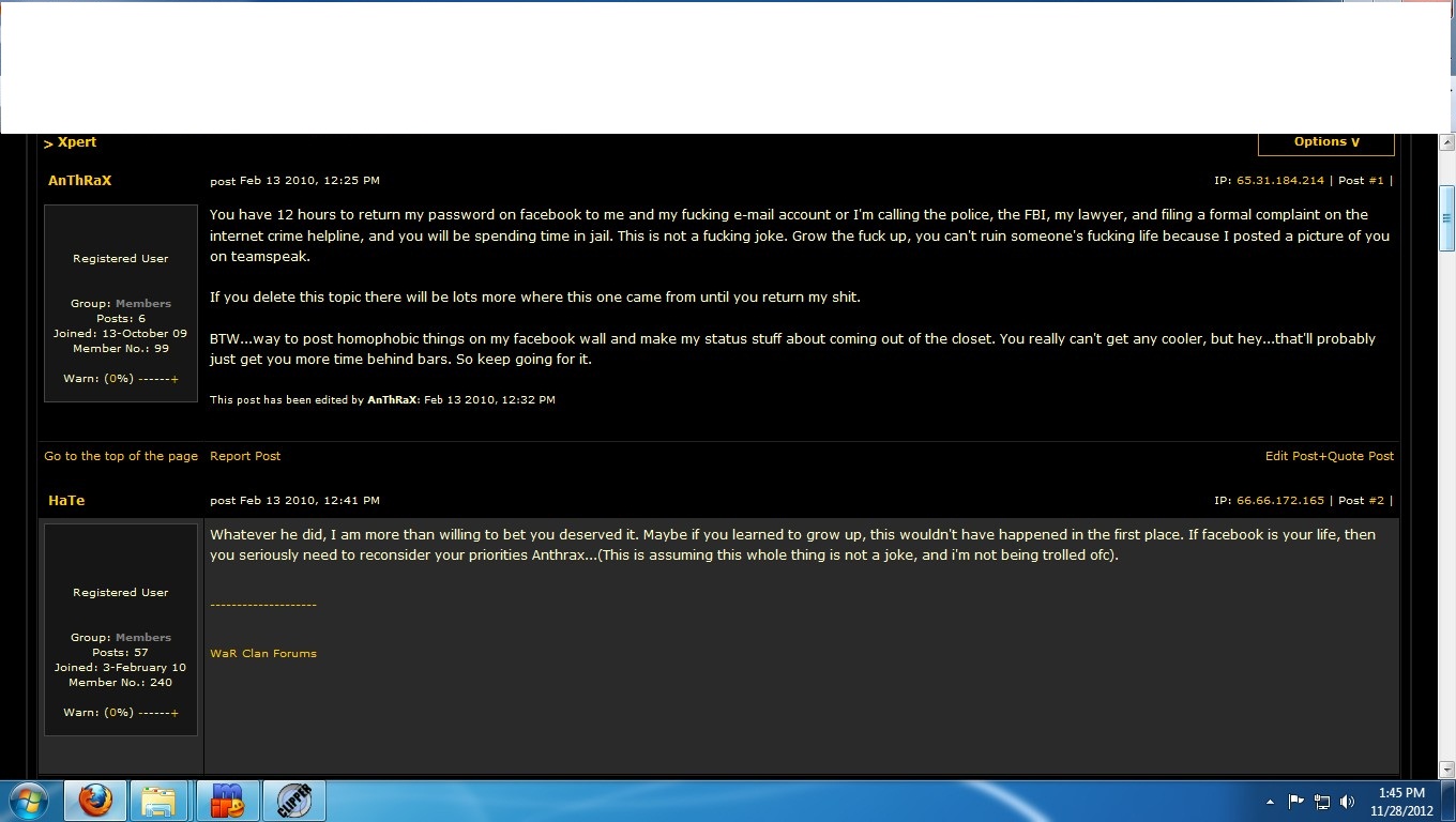 I remember you Anthrax, you're fucking famous too. You were bawling on Teamspeak because your Facebook was stolen and deleted.