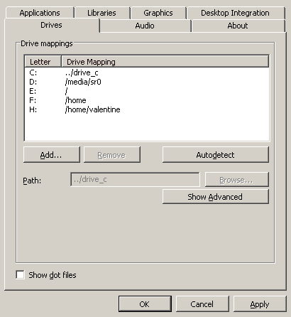 Now navigate to the 'Drives' tab of winecfg. If a D:\ drive is not listed here, or does not point to anywhere, hitting the 'autodetect' button should fix this. If nothing is changed, make sure you have mounted the CD ( and therefore can look at the files on it ). Although Linux filesystems don't have D:\ drives, we need Wine to know what the equivalent is so it knows what to do if a Windows application (eg the Renegade Installer) wants access to a CD.