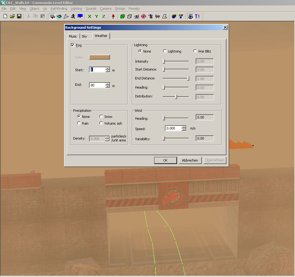 A helpful resource getting some values for the weather is LevelEdit. Make a new mod package, place a .lvl file into the levels dir and load up your mod.