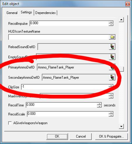 Screenshot of Weapon_FlameTank_Player with certain details circled. If double damage or other effects were intended on secondary fire, they would be controlled by these settings. Instead, they are the same. Therfore different behavior on secondary fire is clearly a bug.