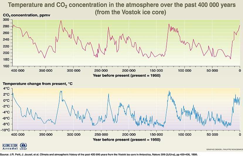 As you see here (in a PROPER ice core data set) rising CO2 concentrations are an echo, an aftereffect of rising temperatures and climate changes.