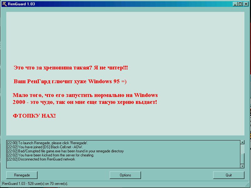 I connected the server and heard some strange voice and then RG gave me a message that my game.exe was broken and I was kicked for cheating %)