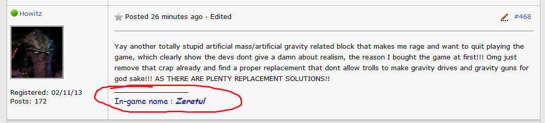 I knew it sounded familiar! That guy bitches and whines in the SE forums all the time about things he has decided are "wrong" in the game... we should all register and PM him with quotes from that topic, see if he remembers Razz