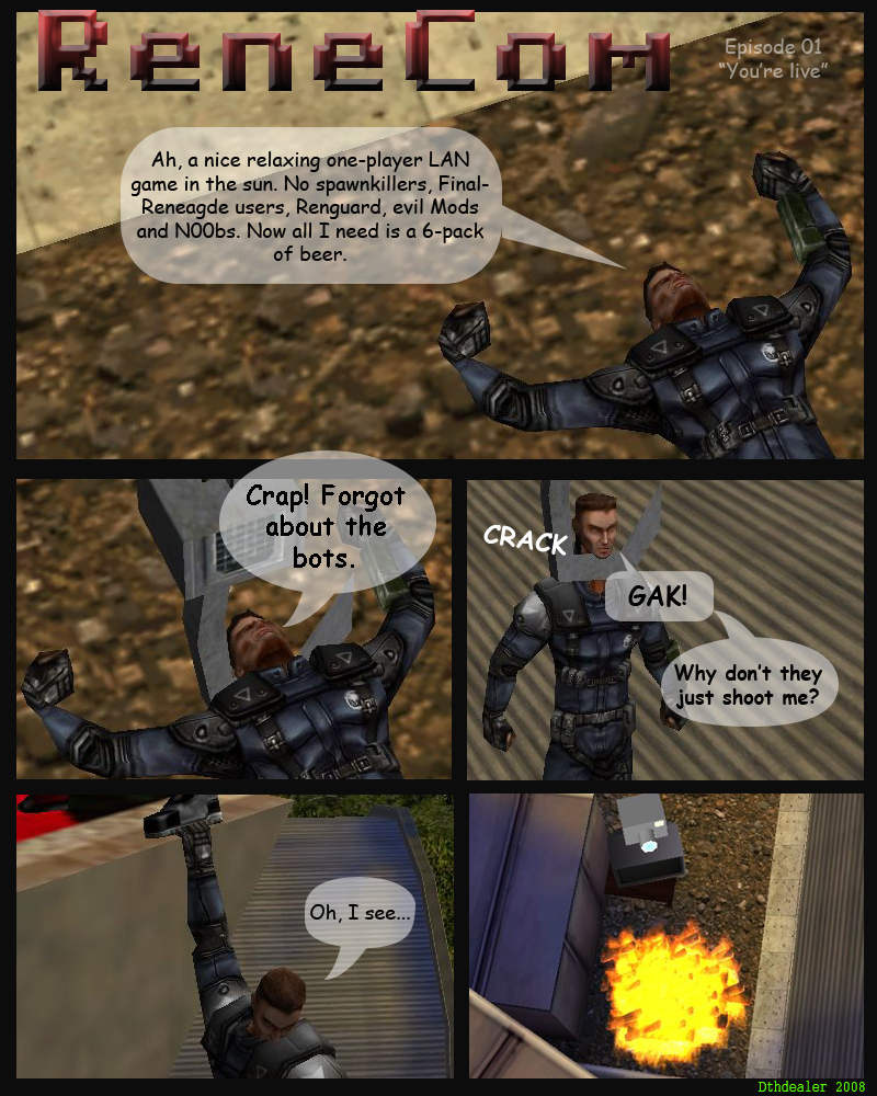 Havoc was posed in RenX for these shots (as describe in the previous post) In the third panel havoc was supposed to have a "bighead", but unfortunately resizing the bone didn't work.