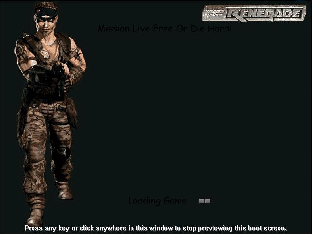 dthdealer:if you make that pick 640x480 i will make you a boot skin for that. now the boot skin's I'm making are going to have nod gdi what ever but windows xp can't handle anything that is above 16 4 bit crap so the boot skins are not that cool but you should see some of them that people make.