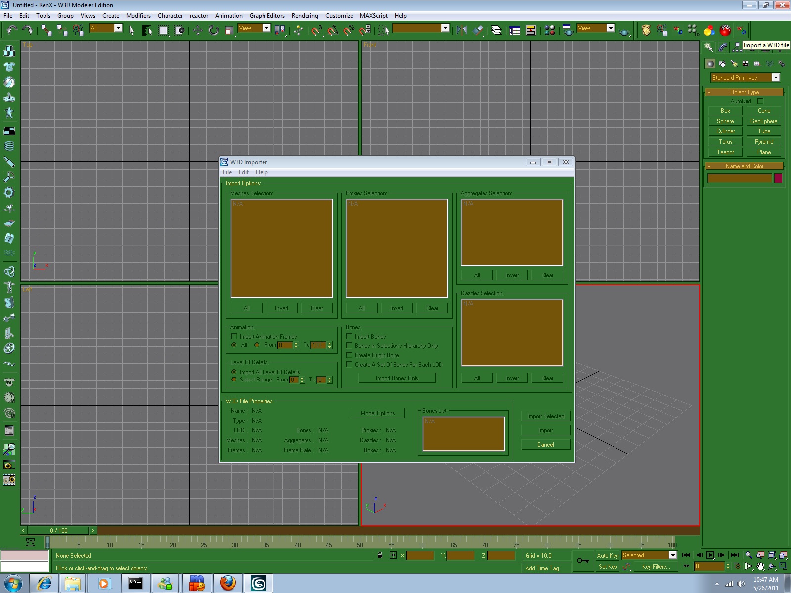 Renx w3d importer will work in 3ds max 8 or 9 got it working in both. I'm using 3dsmax 8 with the renx pack. What version are you using the newest version 2012 or something.