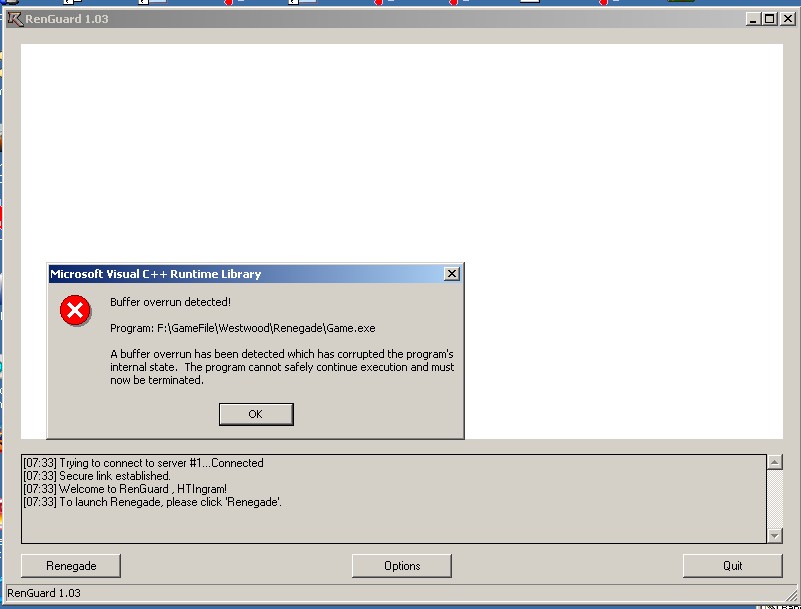 so your saying that the people that have had the buffer overrun error for over a year will NEVER be able to use renguard? I don't understand why this is acceptable to you guys. I have never been able to get renguard to work right again since the launch of 1.03. it worked 100% before this with 1.02.