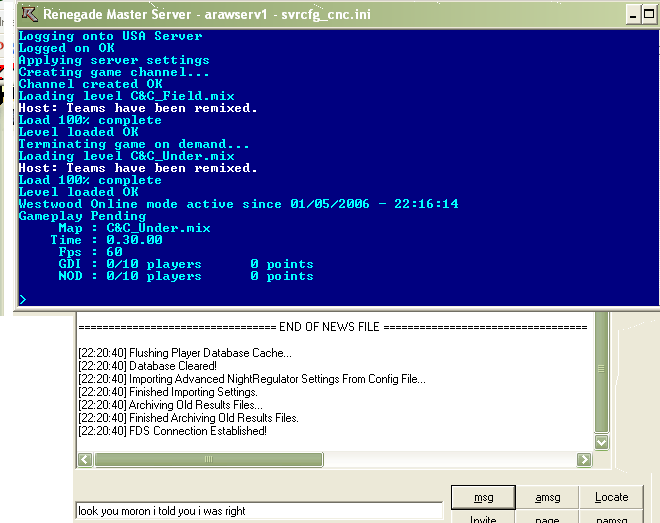 ok nightma wont help me so i thought i ask the rest of you guys, i start the server and i mean just the fds then when its loaded up the levels i push the fds connect in the NR pannel anyways the fds does connect BUT when in game when you type in !help or !commands it doesnt work also when you destroy a building you get a privet pm saying "nod ref is destroyed thanks to you" anyways can any 1 help any 1 please preety please i need this bot to work other wise am screwed