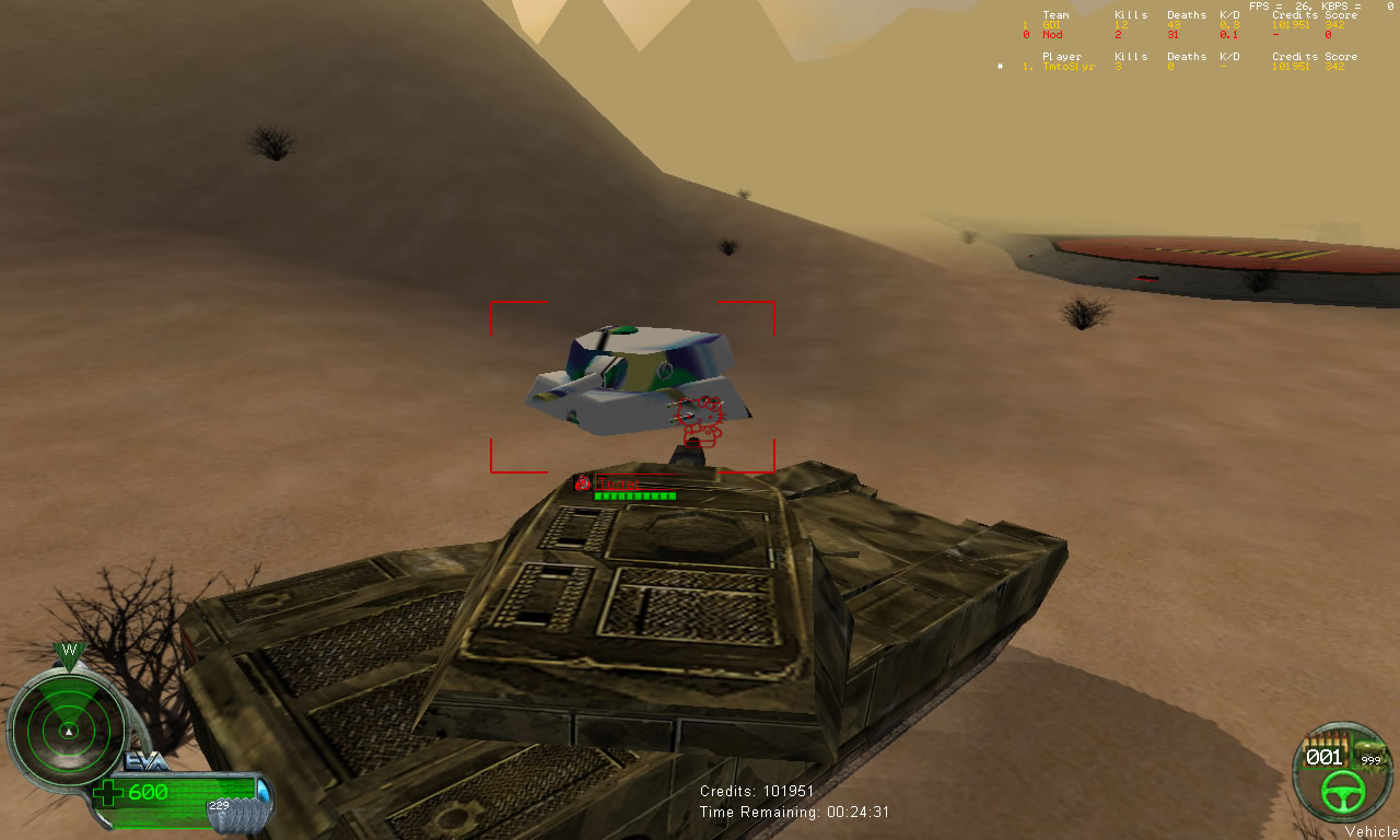 And If I added more vehicals... it would of been low on FPS. (Which is the reason there isn't as many Infantry bots. Tanks bots, believe it or not, consume a lot less FPS than Inf bots. That is why I was able to include so many without the frame rate dropping too drasticly. (The low frame rate is because of the inf that are there, and some of the vehicals)