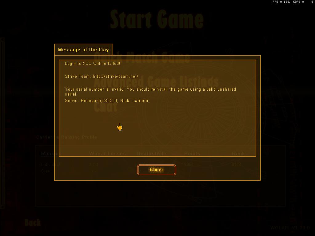 Right. So I installed Renegade using one of my three valid serials (I own every one legally and none of them have been banned from XWIS)