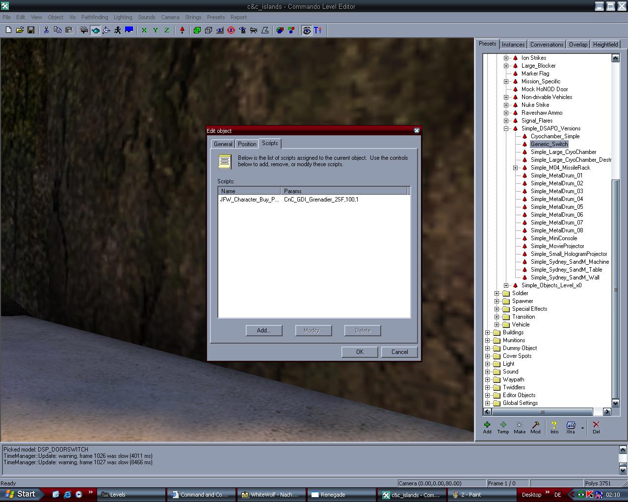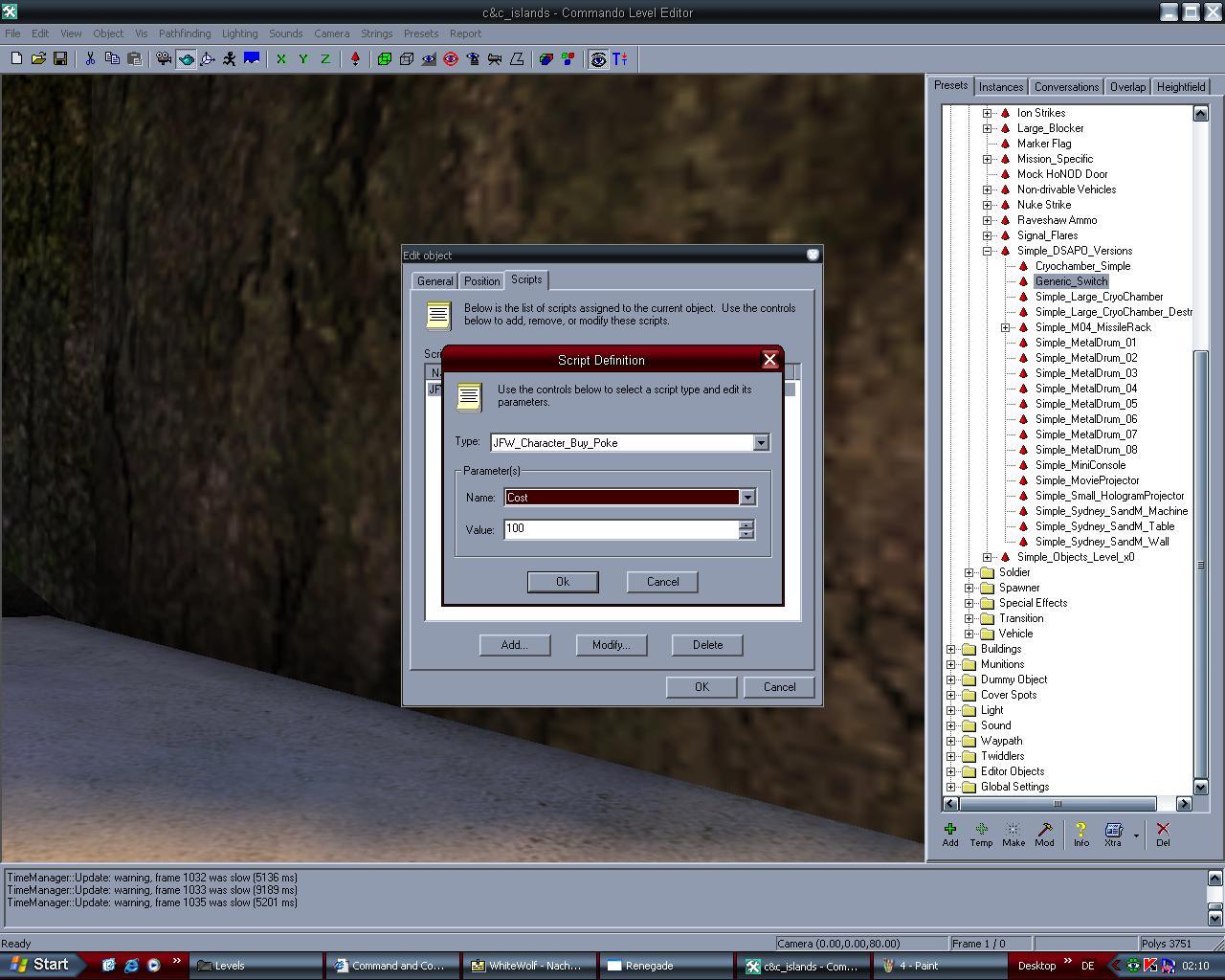 Fill in the other parameters. The cost (in credits) and the player type, which is the team who can poke it. 1 is GDI, and 0 is Nod. Click OK on the Script Definition window and OK on the edit object window. Your script was added. Go into the game and try it out!