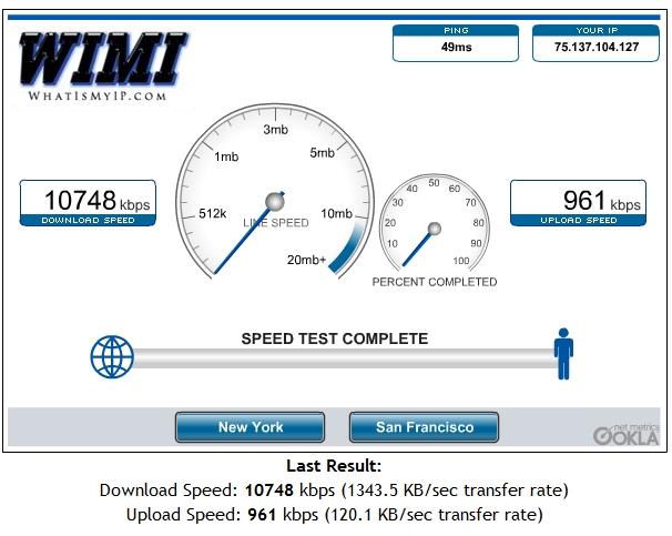 Same here, NY speed is lower. Probably because of information transaction speed. That test is SF