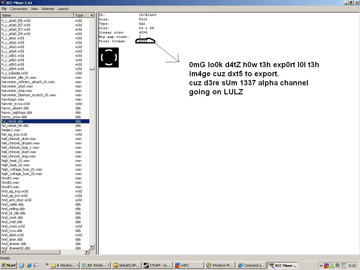 Now use Xcc Mixer and goto the always.dat and look op the original hpad_bolt.dds Xcc Mixer tells you in the right screen which dxt format it is. You need to write it down or remember it. Hpad_bolt.tga was dxt format 1.