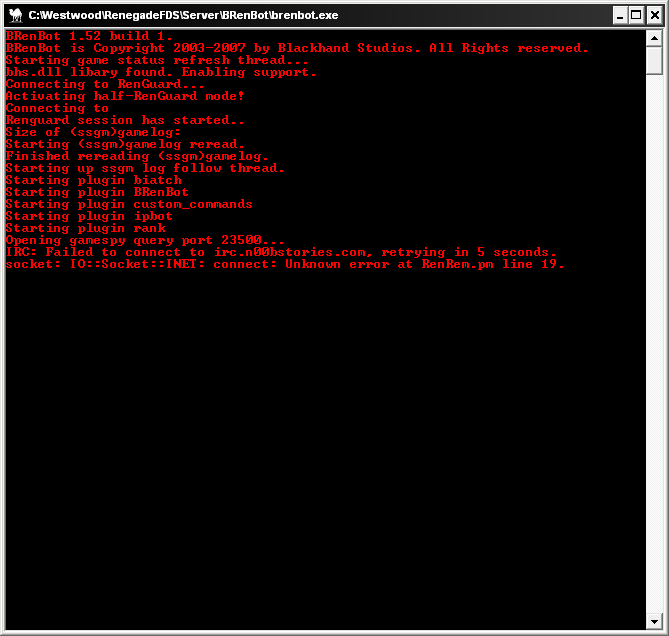Alright, I've been using BR 1.50 for a long time and decided to upgrade. When I 'upgraded', all traces of BR 1.5 out of my renfds folder. Basically I removed the BR folder and the .dll and ini. I downloaded the full BR1.52 installer of off 'http://new.brenbot.com/'. Since I installed BR 1.52, I get this start-up error that I have no clue how to fix.