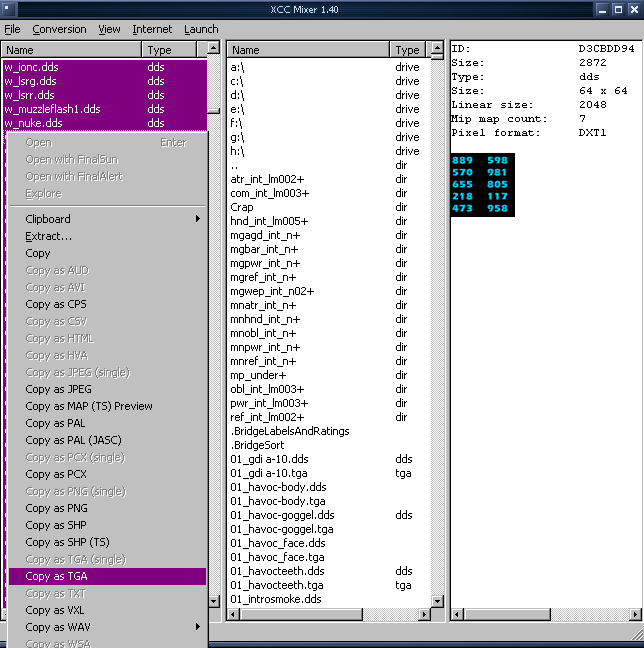 Err... just open the right-pane in XCC, browse to the DIR you want the textures copied to, select them in the left pane, then right-click on one and click on copy as tga.