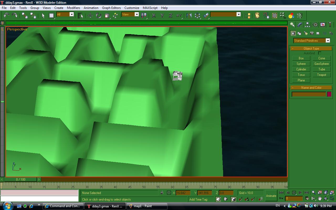 4: That is NOT how you do water. What you want to do is make the island first, make a little bit of a sea floor, then extrude off of the island (preferably all on the same Z coordinate unless you want your water to look stupid), then detach said extrusions and turn that into the water. It'd be a good idea to add in some alpha blending near the shores too, so you'll definitely need to extrude for that part.