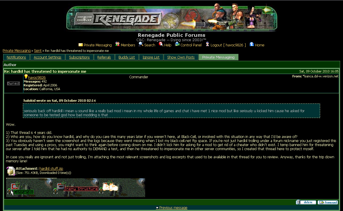 No way some random troll who hadn't read all 16 pages of the renegadeforums thread would know about that claim of being in the military four years later, and know how to find the neoseeker thread which I only discovered through a Google search years ago. Unless he is hardkil or knows hardkil somehow and for some reason wants to take his side despite the existence of real evidence against him, there's no way he'd have that information unless there's someone I managed to piss off here who actually happens to live in the UK (which, to my knowledge, I haven't), or there's someone from the UK or using a UK-based proxy who's trying to pull a fast one on me.