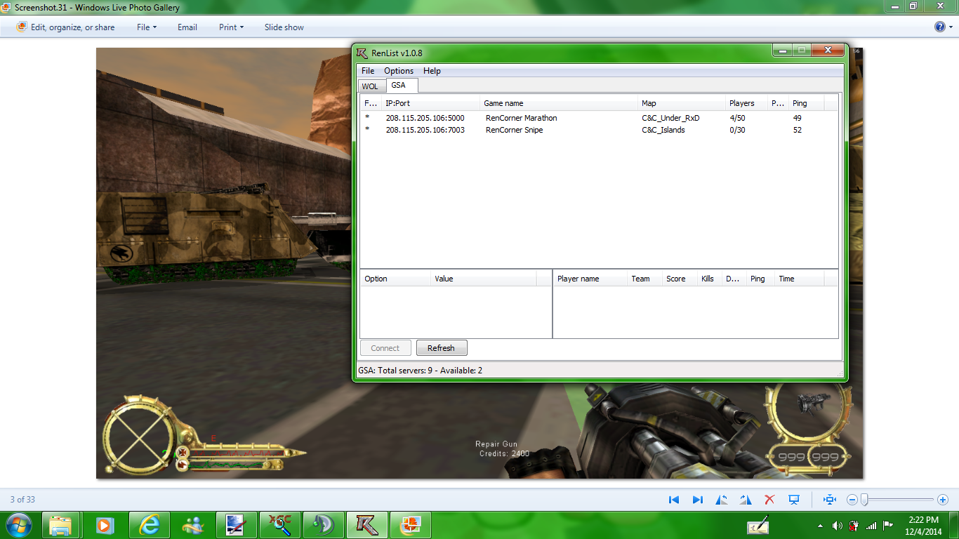 RenList provides the ability to retrieve server list from GameSpy and WOL. You can also connect to any listed servers by pressing "Connect" or double-clicking the selected server.