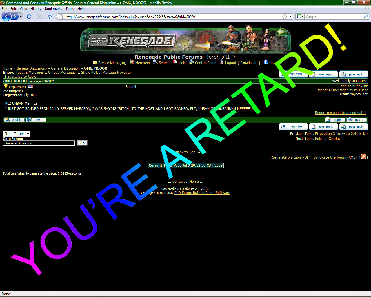 | GigaBiteMe wrote on Wed, 09 July 2008 22:05 | Lol, i was just fooling around. I read through all the posts on renforums and it seems that people here hate when peoples first post is to unban them from forums.