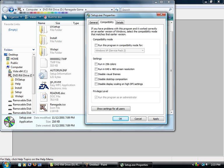 I can run setup up until the part where it says Renegade will install icons to the folder below or you can name your own folder. No matter what name the folder is, when I click next an error pops up saying folder name is invalid, ensure proper syntax. Now someone else said to run setup as admin, didn't work for me. In the other post he tried using a net command in cmd.exe to show the admin account and logged in with that I think. I tried that but cmd.exe says access denied when I try to show the admin account. I'm the only user on this computer. I'm not familiar with Vista as I just bought this computer.