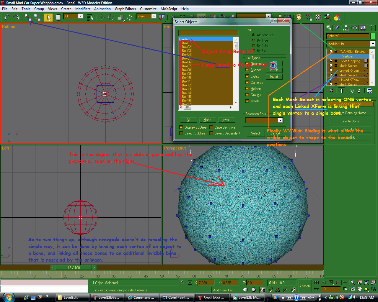 Renegade does not support animations that rescale objects (100%) but with some creativity you can make it support it. Renegade Can scale objects, but it won't change the shape of any object, it will reposition objects that are linked to the object being scaled on the other hand. So if you make a bunch of bones, link those the the object you are rescaling, and then do a mesh bind on the visible object, to the invisible bones then you can rescale the object... let me grab a pic.